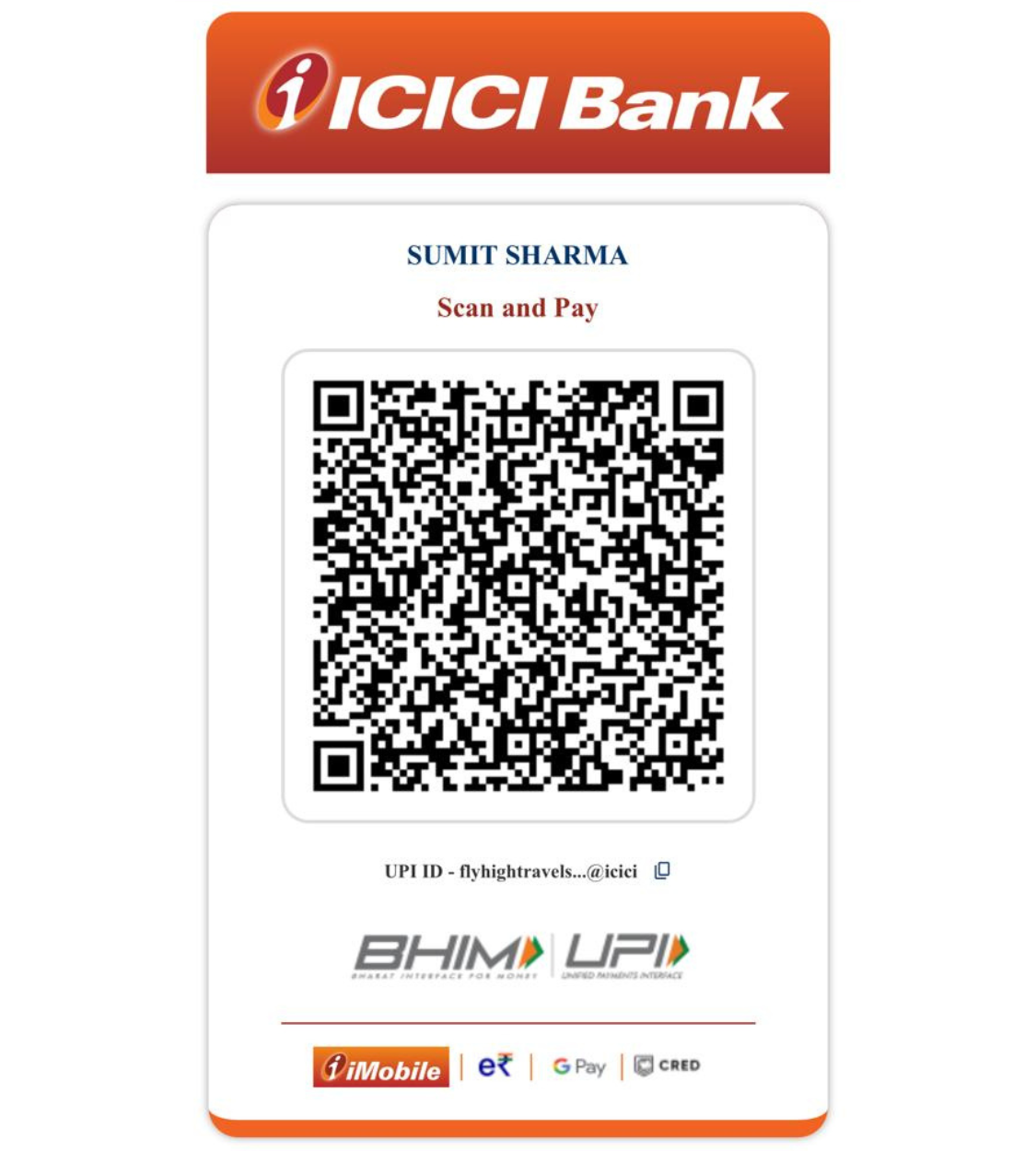 Payment Home/Payment Account Details - FLY HIGH TRAVELS A/c Name : FLY HIGH TRAVELS A/c No. 059405001353 IFSC code: ICIC0000594 Branch : Sec 17 Kurukshetra
